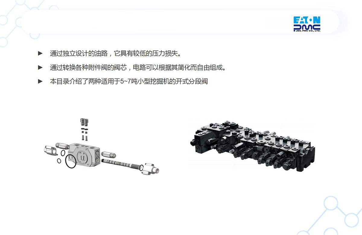 通過獨立設計的油路,它具有較低的壓力損失。 通過轉換各種附件閥的閥芯,電路可以根據其簡化而自由組成。 適用于5~7噸小型挖掘機的開式分段閥
