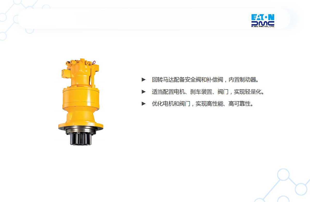 回轉馬達配備安全閥和補償閥,內置制動器。 適當配置電機、剎車裝置、閥門,實現輕量化。 優化電機和閥門,實現高性能、高可靠性。