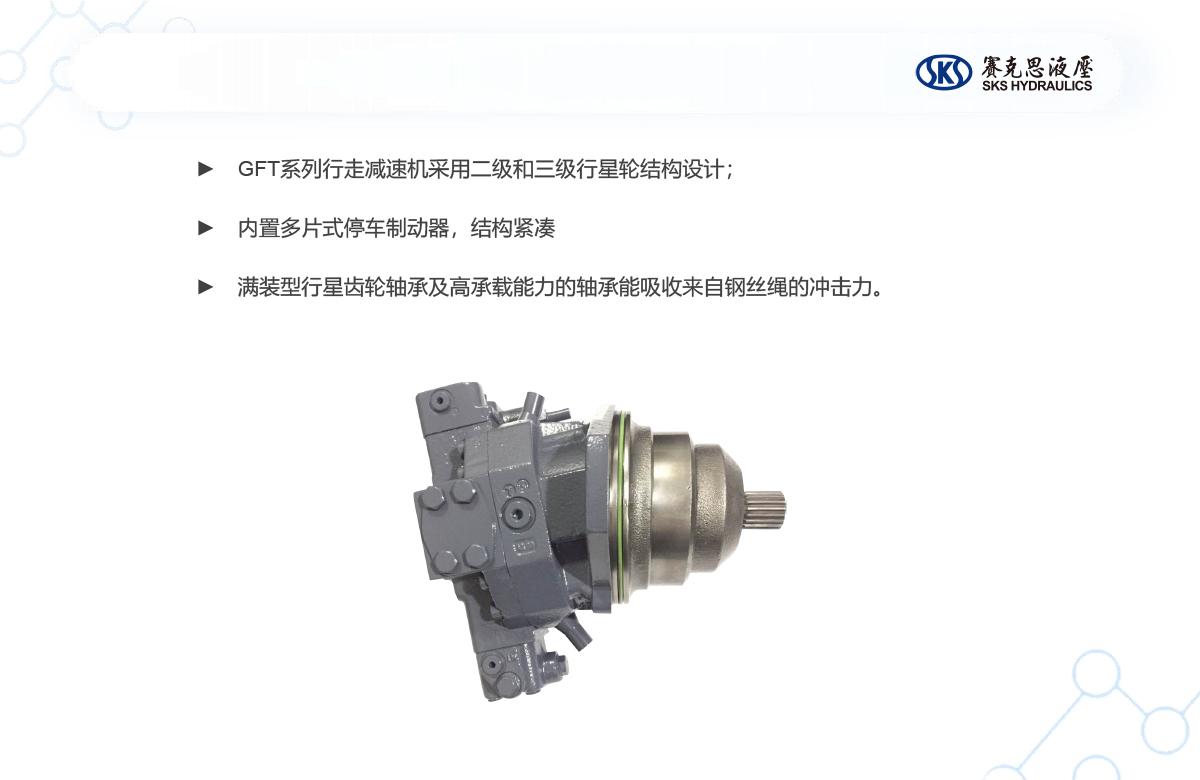 GFT系列行走減速機采用二級和三級行星輪結構設計; 內置多片式停車制動器,結構緊湊 滿裝型行星齒輪軸承及高承載能力的軸承能吸收來自鋼絲繩的沖擊力。